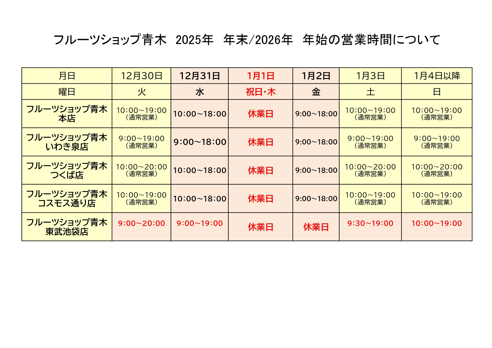 平素よりフルーツショップ青木をご利用頂きまして誠にありがとうございます。 年末年始の営業時間につきましてご案内致します。 お客様にはご不便をおかけ致しますが、ご理解とご協力をお願い申し上げます。