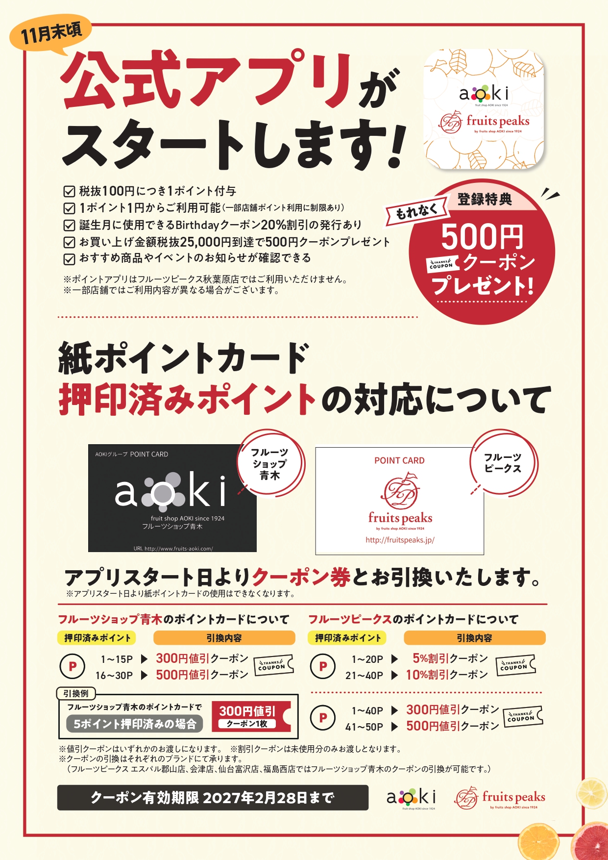 フルーツショップ青木、フルーツピークス公式アプリ配信開始と紙ポイントカード廃止につきましてご案内いたします。